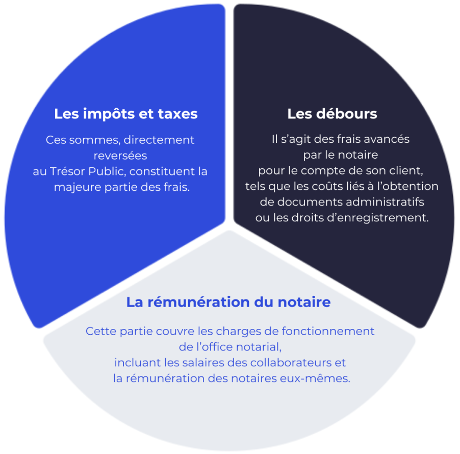 Les frais de notaire versés lors d’une acquisition, d’une donation, ou de tout autre acte notarié se décomposent en plusieurs catégories :